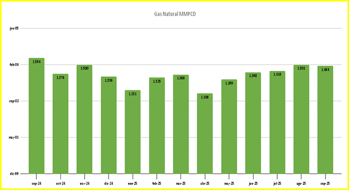 Por otra parte, la producción de gas natural registró una ligera disminución, al pasar de 1,501 millones de pies cúbicos por día (MMPCD) en agosto a 1,484 MMPCD en el mes de setiembre de este año. En comparación con el mismo periodo del año anterior, se observa un caída del 6,9%.