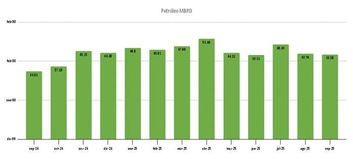 La Sociedad Peruana de Hidrocarburos (SPH) informó que la producción de petróleo en el mes de setiembre de 2025 alcanzó los 43.38 Miles de Barriles por Día (MBPD) superando en 24.6% a lo registrado en el mismo periodo de 2024, según cifras de Perupetro.