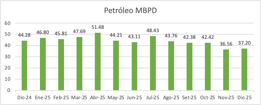 Por otra parte, la producción de gas natural registró un aumento, al pasar de 1,365 millones de pies cúbicos por día (MMCFD) en noviembre a 1,466 MMPCD en el mes de diciembre de 2025. De esta forma, en el año 2025 la producción total de gas natural ascendió a 1,445 MMPCD un 3% menos que lo obtenido en el año 2024 (1,395 MMPCD).