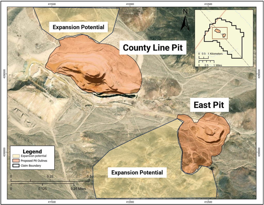 El proyecto County Line incluye dos minas a cielo abierto históricas: County Line y East Pit. La producción inicial proviene del fondo de la mina County Line, mientras que, en paralelo, la compañía prevé extraer mineralización de menor ley desde la Mina Este. Para el segundo semestre de 2026 está programada la recuperación del tajo County Line, un proceso que se extenderá hasta la segunda mitad de 2027 y que permitirá acceder a oro adicional de alta ley.