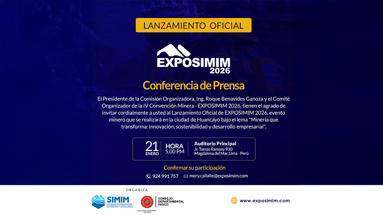 El Presidente de la Comisión Organizadora, Ing. Roque Benavides Ganoza, y el Comité Organizador de la IV Convención Minera – EXPOSIMIM 2026, tienen el agrado de invitar cordialmente a usted a la Conferencia de Prensa por el Lanzamiento Oficial de EXPOSIMIM 2026, evento que reunirá a los principales actores del sector minero nacional e internacional.
